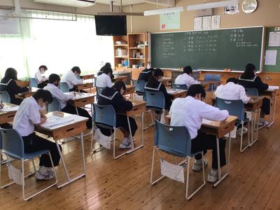 今日は期末テスト2日目です。みんな真剣な表情で、一生懸命テスト問題に取り組んでいます。最後まで粘り強く頑張りましょう。