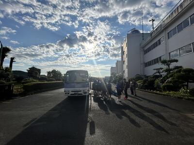 男女の団体戦に臨むソフトテニス部が出発です。